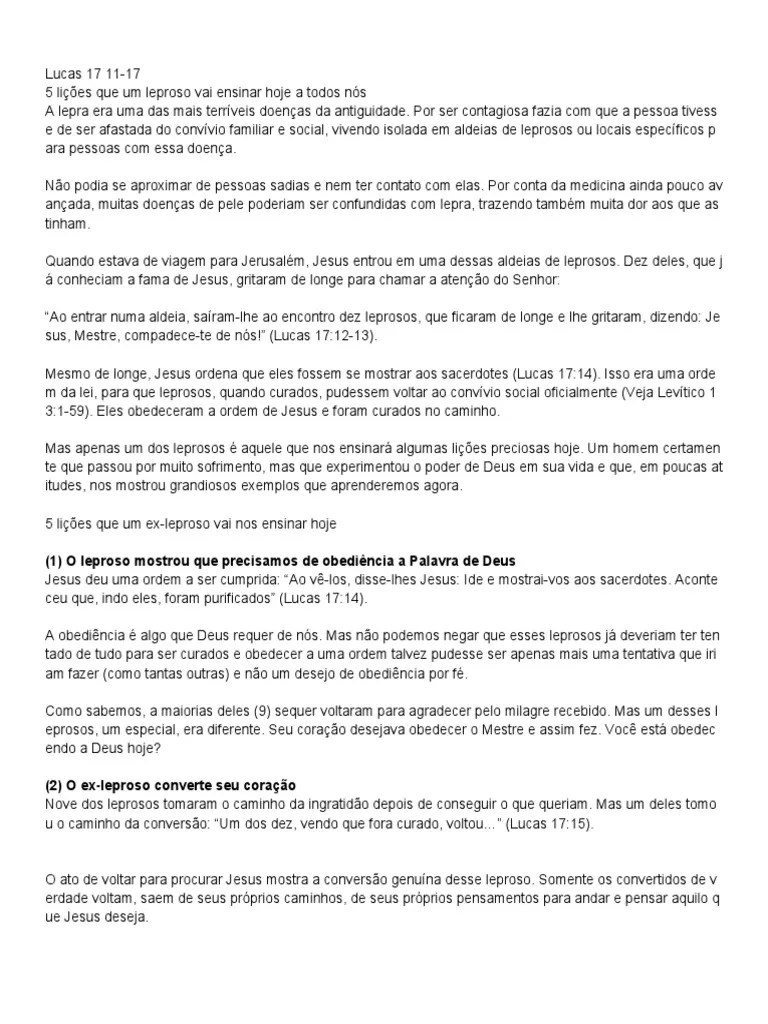 E aconteceu que, indo eles, ficaram limpos. A cura dos 10 leprosos leitura lc 17: Ele fica ali com os discípulos, longe dos seus inimigos. , a ingratidão é um grande perigo que ronda a vida dos crentes. Talvez de todas as enfermidades, esta era a mais temida. E aconteceu que, indo eles, ficaram limpos. O coração grato de um leproso curado; Vamos nos concentrar um pouco na reação desses leprosos... E ele era um samaritano (implicando, acredito que pelo menos, alguns dos outros eram judeus, o que significa que eles estavam familiarizados com a lei e eles sabiam sobre jesus e suas reivindicações).