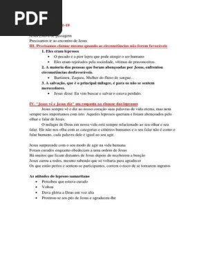 O coração grato de um leproso curado; Os leprosos, gritavam em coro, ao verem jesus, em uma aldeia da galileia. Vamos nos concentrar um pouco na reação desses leprosos. A restauração completa de um leproso; O mestre porém, ao invés de seguir para o sul, indo diretamente para jerusalém, escolhe passar nos confins de samaria (onde morava a mulher samaritana) e galileia. Os dez leprosos tiveram fé em jesus. Jesus, mestre, tem misericórdia de nós lc 17;13. Claro que ninguém desejava ter outras doenças, mas a lepra era a mais.. Ele fica ali com os discípulos, longe dos seus inimigos.